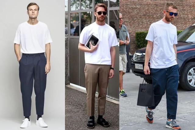 而在T恤的選擇中,白色的款式最為百搭,而且白色的效果能為造型帶來簡潔感,隨便搭配一條九分西褲造型就時髦得體。