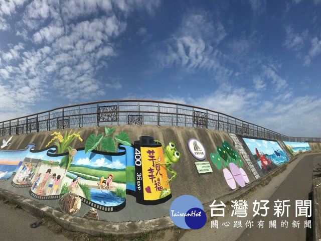 西勢海堤堤防,去年是以海洋為主題的螃蟹、鯨豚、海鳥等構圖呈現。今年則是以在地農漁業為主題,打開遇(芋)見幸福的記憶膠卷,構圖以相機膠卷勾勒出大甲地區「芋米之鄉」及歡樂童年嬉戲農村景象,青蛙與白鷺鷥則表現農漁村保持優良生態成果。另一幅則是以松柏漁港膠筏漁船、西勢海濱特有生物赤嘴仔、及傳統石滬堆疊構圖呈現「匠」字隱申匠師的故鄉;另以農村休耕稻田種植之景觀作物向日葵及保育生態環境成果之蝸牛、海龜等,呈現地方生態之美以及休閒漫遊好地方。