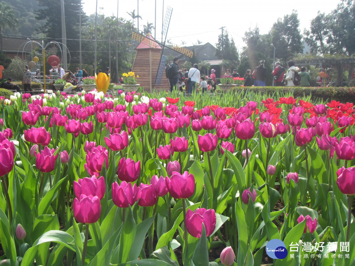 2018士林官邸鬱金香展13日登場,以「遇見荷蘭」為題,展出超過20種、共計約3萬株五彩繽紛的鬱金香,搭配風車及木鞋妝點佈置,宛如置身荷蘭花海。台北市長柯文哲表示,鬱金香展覽期從2月13日至2月28日,剛好跨過農曆新年,歡迎民眾新年期間來士林官邸走春看鬱金香。