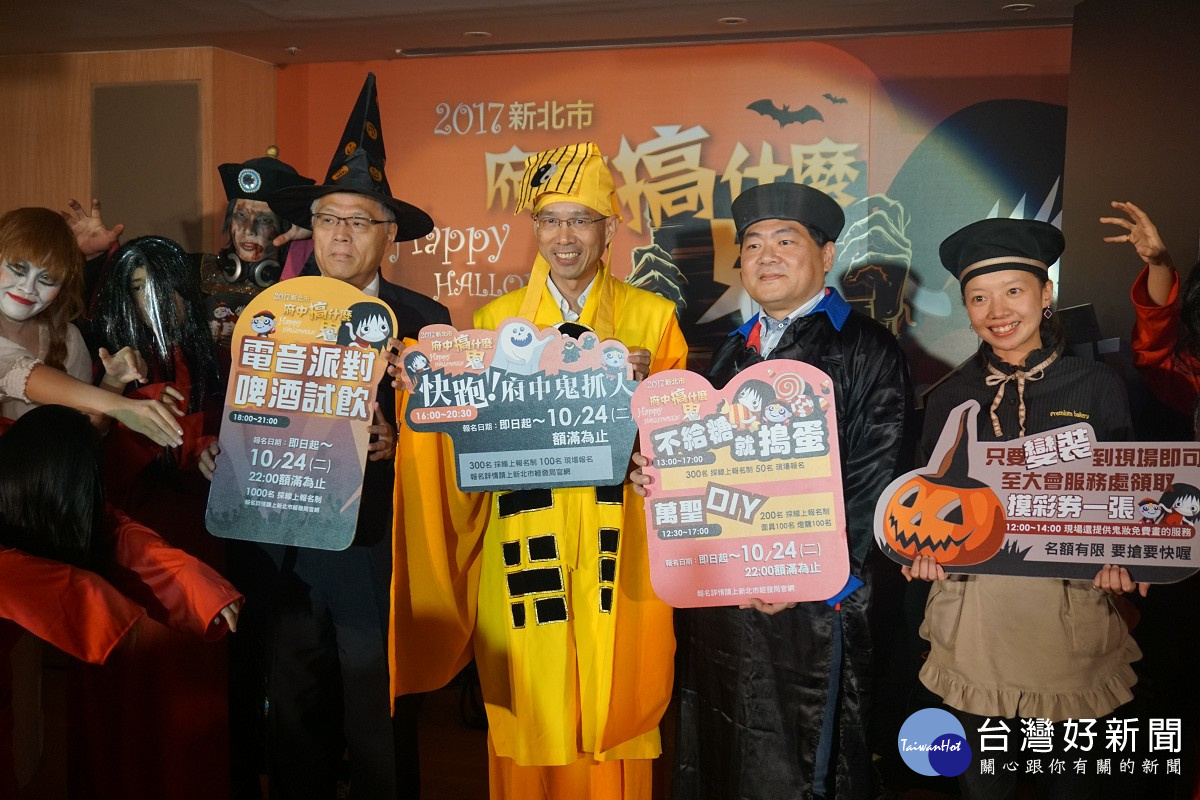 新北市萬聖節活動28日將於板橋府中商圈搞鬼趴與變裝遊行,經發局指出,除了遊行比賽之外,現場還可以體驗最刺激的辦公椅鬼抓人,晚上還有全台首次封街電音派對,挑戰你的視覺與聽覺,讓你度過個活力十足的萬聖夜。且活動當日只要有裝扮,即可至大會服務處領取摸彩券乙張,有機會抽中智慧型手機、腳踏車及商圈購物券等好禮。