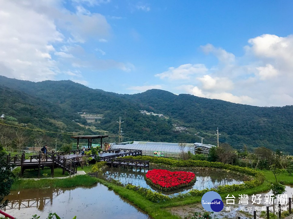 大地工程處表示,今年同心池採紅、綠色環繞的方式布置,內島區以聖誕紅排列成心型,聖誕紅花語有祝你幸福的涵義,代表一顆真摯愛戀的心,外圍則以綠色的金露花環繞,流傳金露花源自宋朝秦觀《鵲橋仙》,象徵忠貞愛情的可貴,同心池雙心輝映,見證情侶的幸福愛情,也是民眾打卡的熱門景點。