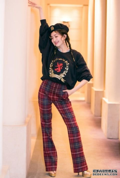 江疏影身穿一件黑色印花上衣,印花的設計使這件衣服不會顯得過於單調,同時也增加了衣服的設計感。再來看江疏影的下半身搭配,她身穿一條西裝格子褲,紅黑格子形狀的褲子搭配黑色印花上衣,立馬凹顯了江疏影的氣質!