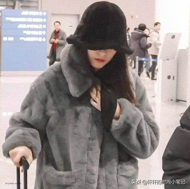 鄭秀晶穿這件灰色毛絨外套之所以這麼好看,還離不開頭上戴的這款黑色毛絨帽子,鄭秀晶戴上后,有點貴氣有點精緻,卻又不會顯老,真的是感覺非常棒啊。而且這頂黑色帽子,同樣是採用毛絨絨的面料,與這件灰色外套真的是很登對了哈。