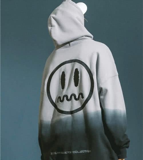 第二件漸變色的衛衣,笑臉變成了小“哭臉”一臉不高興的模樣,從灰色到黑色的完美漸變,好像水墨畫一般,再穿一雙同等冷色系的帆布鞋,校花看到你都會心動的。