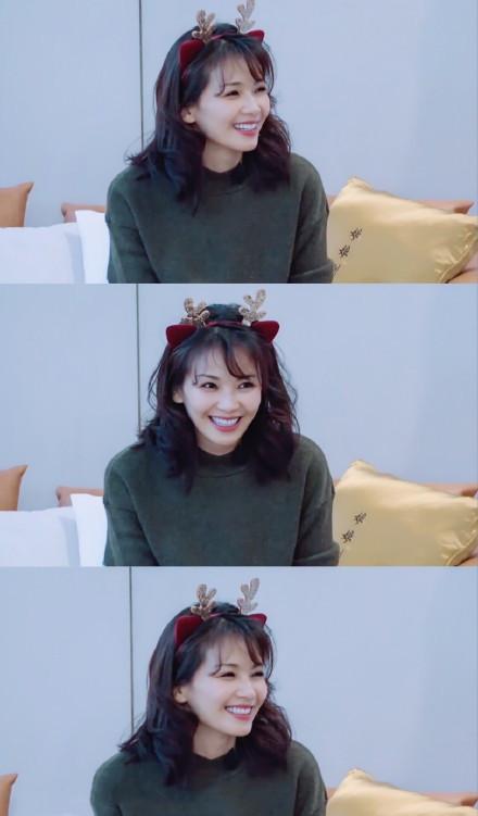 40歲的劉濤穿綠色毛衣戴鹿角發箍