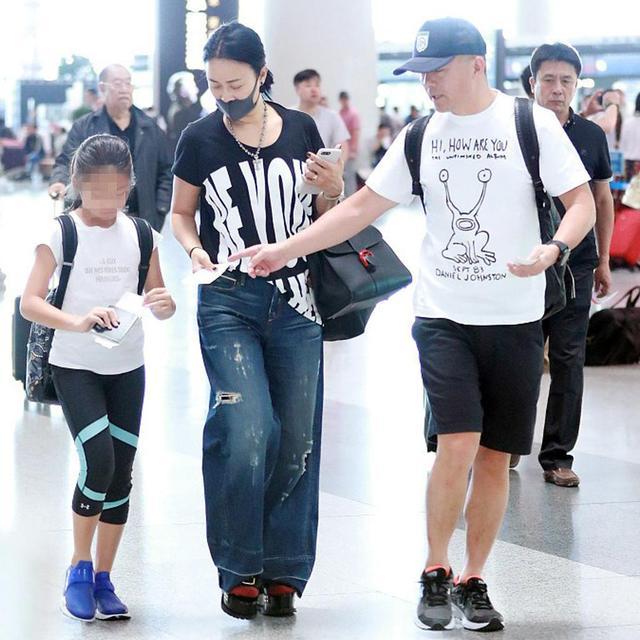 那英一家三口出行,T恤配闊腿褲